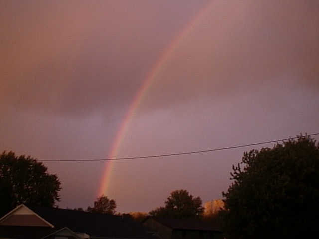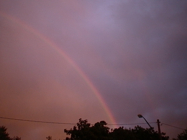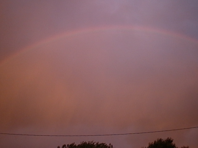 I had never seen a double full arc before, and the inner one was the brightest I had ever seen. They had begun to fade by the time I got my camera; the outer one is only just barely visible near the bottom, just above the power line.
